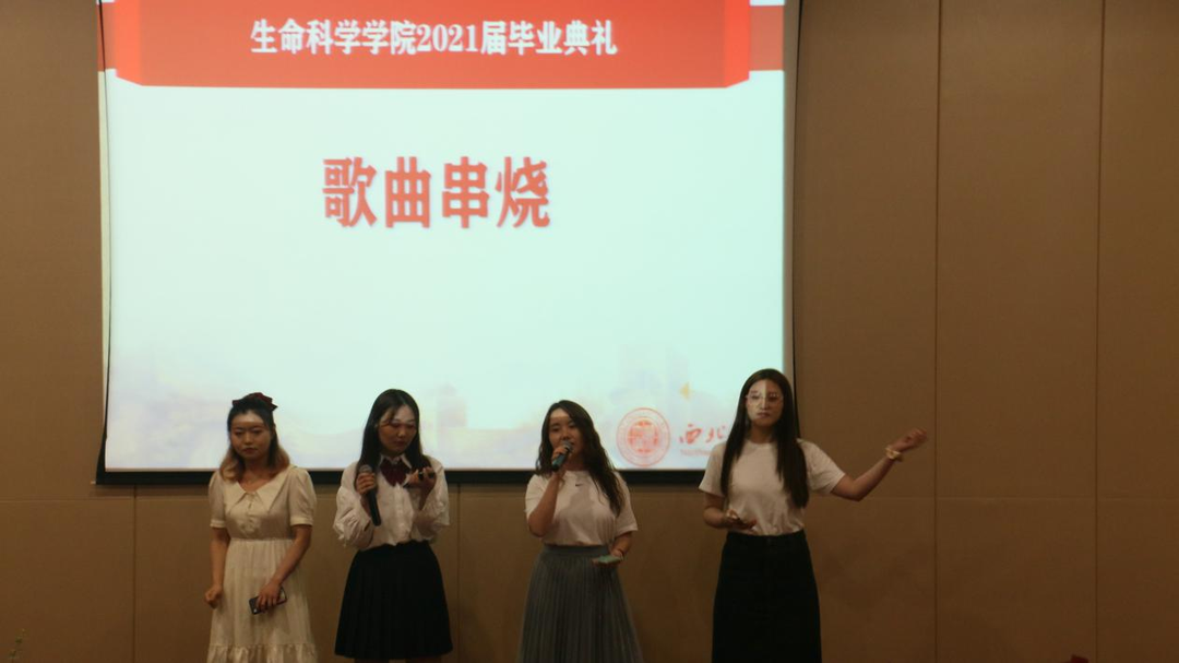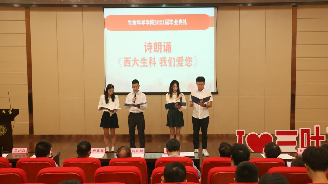 典礼期间,四位同学深情朗诵,向学校、学院和老师们表达着感谢与不舍。郭佳惠老师和三位同学的歌曲串烧,唱出了所有的回忆,唱出了全部的友谊,最美的青春留给母校、留在西大。