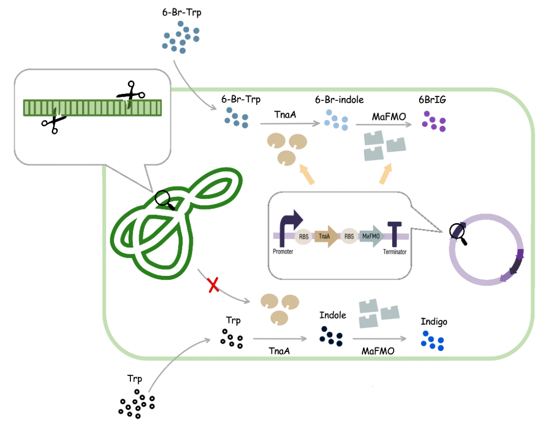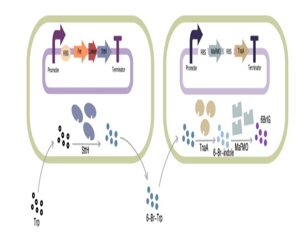最终,项目敲定采用双细胞系统,进行生产时空分离,以达到帝王紫代谢通路中相关酶的最高利用效率,并严格筛选基因表达调控原件,构建帝王紫高纯度,高产量双细胞体系。
