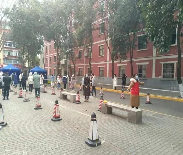 “五号楼的同学下楼做核酸喽” “核酸时间很短,大家尽快排队”“请大家排成三路纵队” “注意保持一米五间距”…………