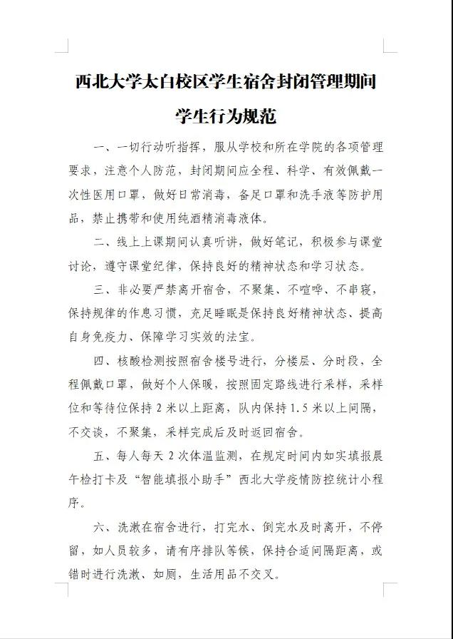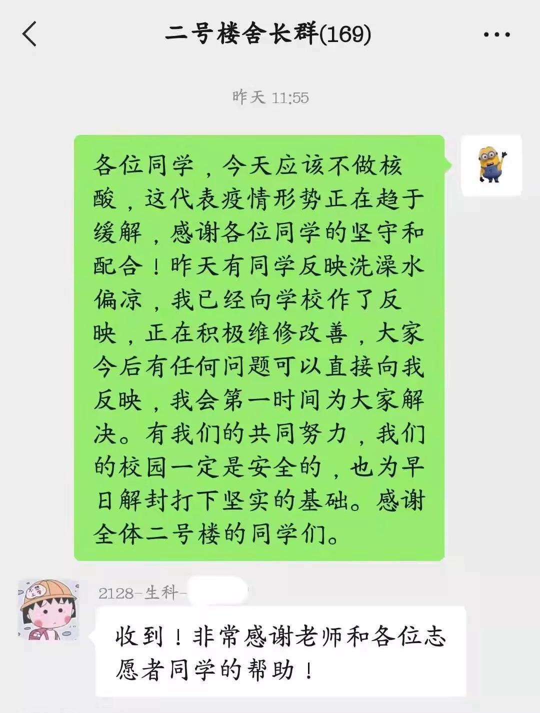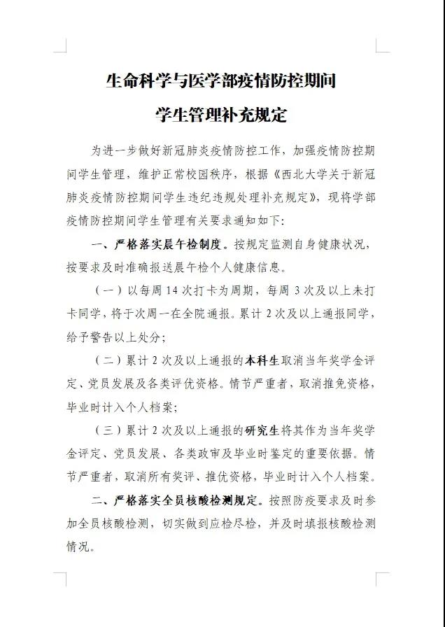 学部制定《必赢bwin网页版官网太白校区学生宿舍封闭管理期间学生行为规范》《生命科学与医学部疫情防控期间学生管理补充规定》《生命科学与医学部线上教学十条规范》,严格规范学生落实晨午检制度、全员核酸制度、隔离工作制度、线上学习制度、错峰就餐洗澡规定,全面开展心理排查,开设学生反馈通道,对学生诉求坚决做到“事事有回应,件件有着落”;秉持学生“一个也不能少”的工作原则,抗疫物资和生活关怀同步第一时间送到空军军医大学联培学生、附属医院临床学生手中,突破时空和地域局限,最大程度关怀全体学生。