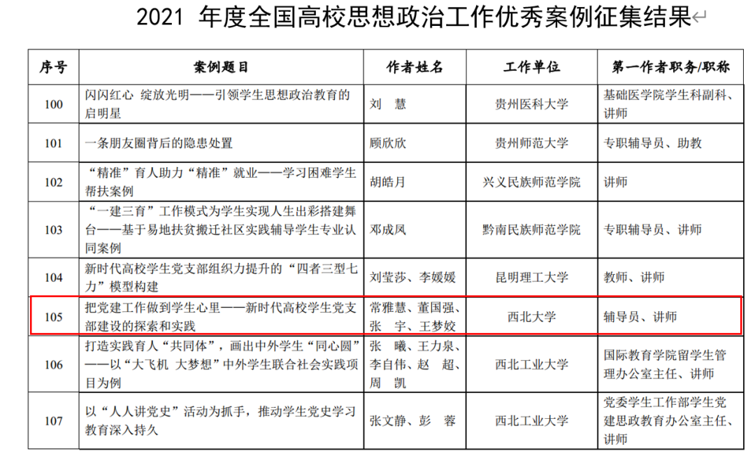 近日,在2021年度全国高校思想政治工作优秀案例征集活动中,必赢bwin官网《把党建工作做到学生心里——新时代高校学生党支部建设的探索和实践》思政工作案例获全国三等奖。