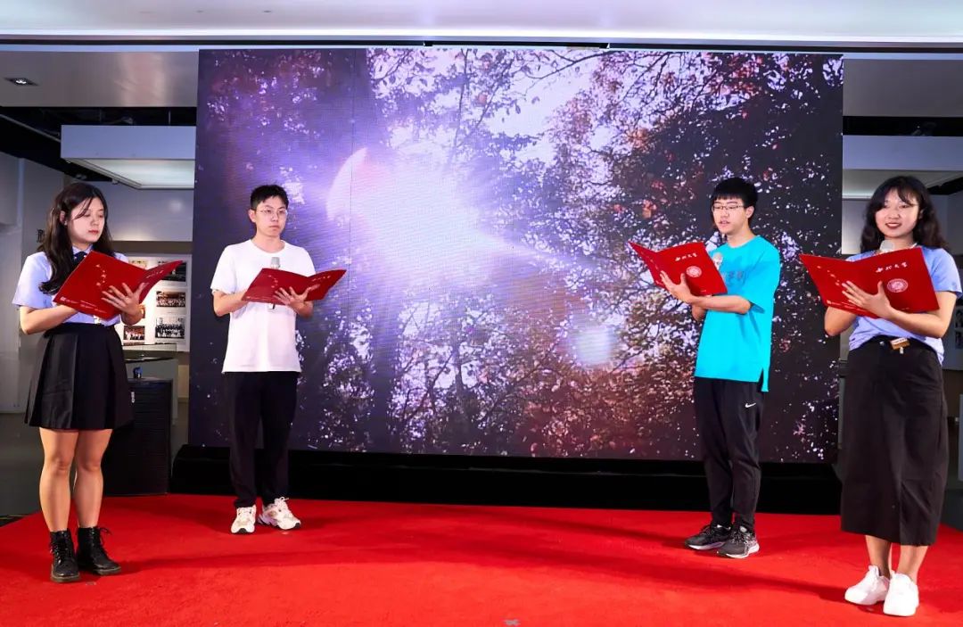 典礼期间,四位同学深情朗诵,向学校、学院和老师们表达着感谢与不舍。毕业歌《三叶草的约定》唱出了所有的回忆,唱出了全部的友谊,最美的青春留给母校、留在西大。MV精彩情节,引得台下阵阵掌声。