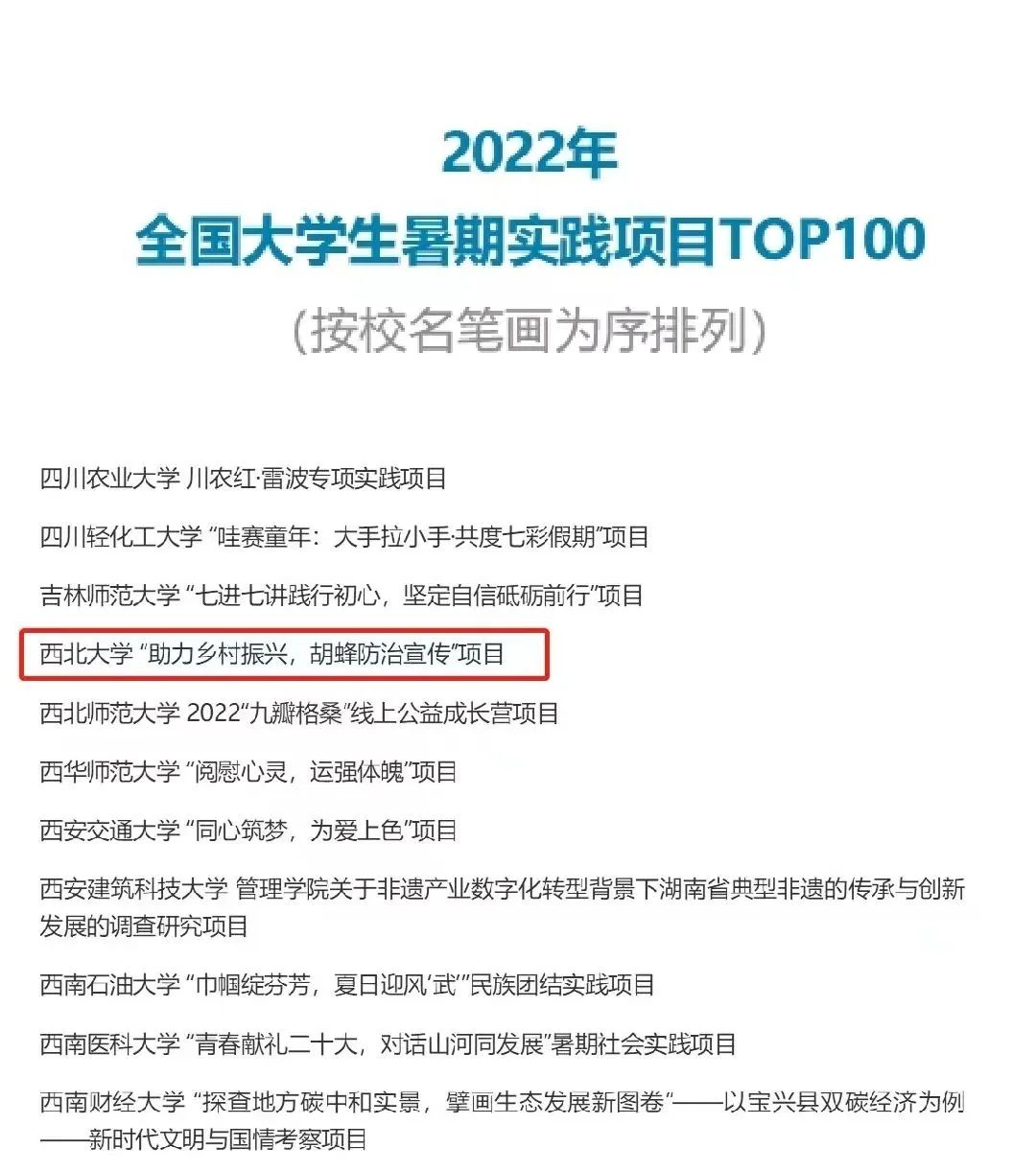 近日,由中国青年报举办的“2022年第八届全国大学生暑期实践展示活动”名单揭晓,我校必赢bwin网页版官网“助力乡村振兴,胡蜂防治宣传”项目入选“2022年全国大学生暑期实践项目TOP100”。