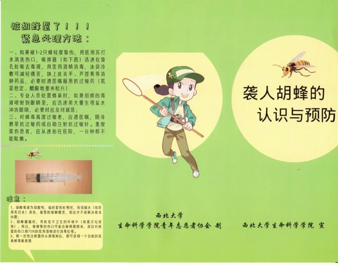 专业书籍出版,守护民生安全。本项目的指导教师谭江丽教授基于项目前期团队与本团队学生一起编撰的《等闲识得胡蜂面-图说胡蜂的认识和防治》一书已出版;在此基础上,学生自主编制的《袭人胡蜂认识和预防》宣传手册现已在岚皋县、平利县印发2000余份。书籍的宣传推广让不少群众走出了对胡蜂的认识误区,使民众进一步了解胡蜂的致命性并提高科学认识,切实保障人民的生命财产安全。