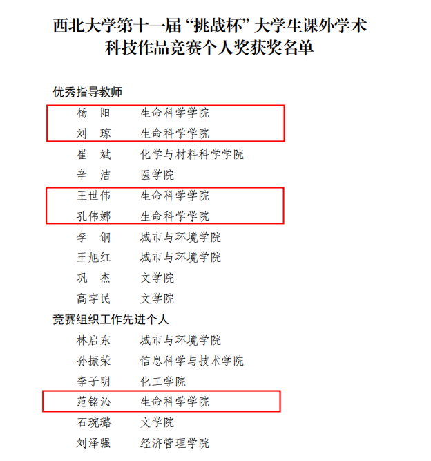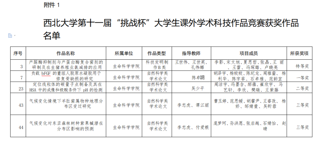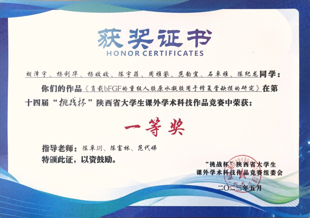 在第十四届“挑战杯”陕西省大学生课外学术科技作品竞赛中学院1个项目荣获省级一等奖,在必赢bwin网页版官网第十一届“挑战杯”大学生课外学术科技作品竞赛中学院获“优胜杯”荣誉称号,1个项目获校级特等奖,1个项目获校级一等奖,1个项目获校级二等奖,2个项目获校级三等奖。此外,杨阳老师、刘琼老师、王世伟老师、孔伟娜老师获“优秀指导教师”荣誉称号,范铭沁老师获“竞赛组织工作先进个人”荣誉称号。让我们来看一下获奖项目名单吧!