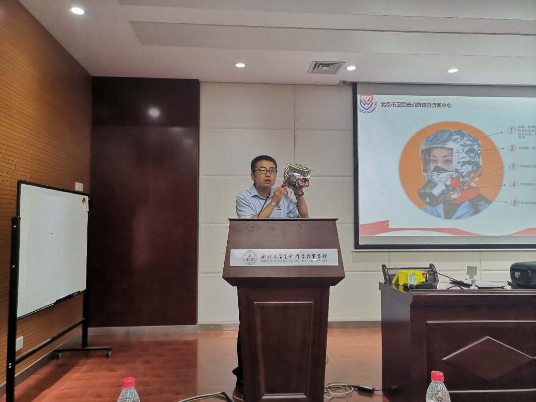 开幕式结束后,董湃教官为师生作消防安全培训讲座。他指出,本次安全培训主旨为人人讲安全,个个会应急。通过一系列真实发生在身边的案例,强调了实验室安全以及学会应急处理措施的重要性。董教官提出,实验室安全隐患存在的主要原因在于消防安全设施配置不足、个人防护措施不到位、监管薄弱、实验人员安全知识缺乏以及侥幸心理作祟,应从多方面预防。随后演示了多种不同危急情况下的应急措施,如防毒面具的使用、逃生绳索的打结方式和几种常见灭火器的使用方法及注意事项。最后,董教官与师生们进行互动交流,积极解答了在实验室生活中存在的安全隐患问题,给予合理的建议。