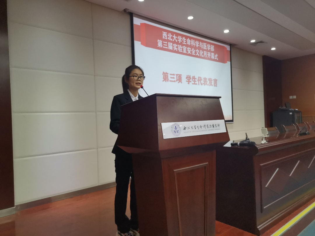 2022级中药学专业硕士研究生王孟媛作为学生代表发言,她以实验室安全的四不伤害原则为切入点,从学生角度出发讲解了如何规避风险及如何应对遇到的突发安全事件,呼吁同学们提高实验室安全意识,自觉遵守实验室安全规定,养成良好的科研习惯和素养。