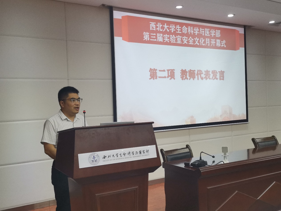严兴荣副主任作为教师代表进行交流发言。他提出,提高实验室安全意是对家庭的负责,希望通过本届实验室安全文化月能够让师生们进一步掌握实验室安全技能、降低实验室生活风险,并鼓励大家积极参与接下来的安全培训、应急演练及实验室安全文化月系列活动,能够在其中有所收获。