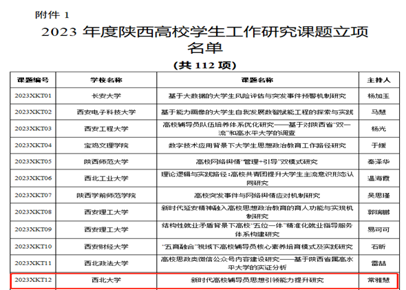 10月8日,学校公布了2023年度学生工作研究课题和精品项目立项结果,必赢bwin官网2个项目获批立项,由常雅慧申报的《新时代高校辅导员思想引领能力提升研究》和刘凌飞申报的《PEMER理论视域下大学生专业教育与劳动教育融合路径研究》获批重点项目。其中,《新时代高校辅导员思想引领能力提升研究》获批为2023年度陕西高校学生工作研究课题。