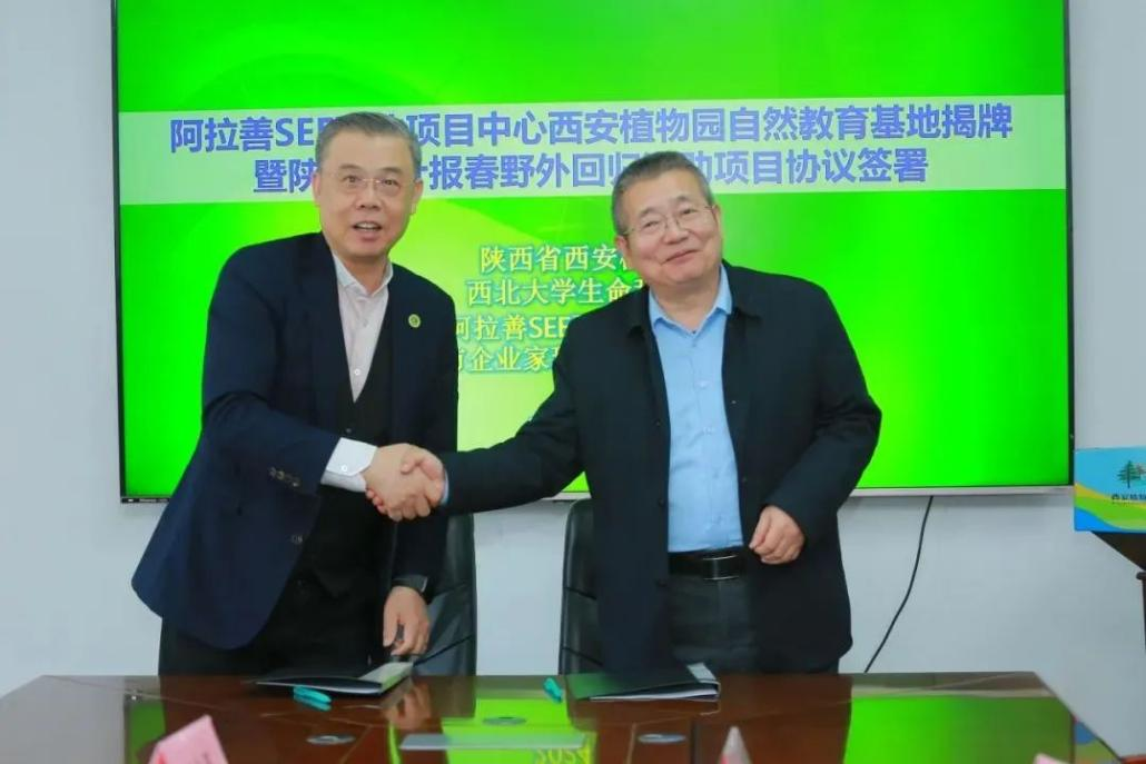 随后,西安市企业家环保基金会理事长王辉和西安植物园主任岳明签署“陕西羽叶报春野外回归项目”资助协议,阿拉善SEE西北项目中心邹斌主席、西安市植物园岳明主任教授、必赢bwin网页版官网党委副书记魏宁共同为自然教育基地揭牌。