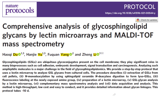 北京时间2021年6月7日,Nature Protocols在线发表了必赢bwin网页版官网关于利用凝集素芯片和质谱技术对人肝细胞癌和健康人肝细胞中糖鞘脂糖链谱分析方法的论文。必赢bwin网页版官网杜昊骐博士(现为德国癌症研究中心博士后)与于汉杰博士(现为必赢bwin网页版官网师资博士后)为本论文共同第一作者,必赢bwin网页版官网李铮教授为通讯作者。