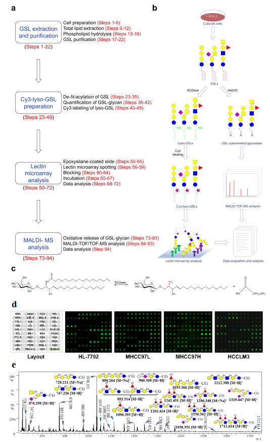 李铮教授课题组于2019年发表了基于凝集素芯片技术的糖鞘脂糖链谱分析新方法(Du et al., Anal. Chem., 2019),该方法为进行糖鞘脂组学领域的研究提供了新技术手段。2021年,该课题组在Nature Protocols上深入报道了详细实验步骤及条件参数。该研究基于功能糖组学实验室使用凝集素芯片技术在细胞、组织、血清、唾液等生物样本中糖蛋白糖链谱的研究工作上取得的诸多进展,建立了基于凝集素芯片技术分析糖鞘脂糖链谱的方法(图1a-c)。该方法包含:①从培养的细胞(1株健康人肝细胞系(HL-7702)和3株具有不同转移能力的人肝癌细胞系(HCCLM3、MHCC97H 和MHCC97L))中提取糖鞘脂(GSLs);②使用鞘脂神经酰胺脱酰基酶(SCDase)进行去乙酰化生成Lyso-GSLs;③ 在Lyso-GSLs新暴露出的氨基上进行荧光标记(Cy3 labeling);④ 凝集素芯片的制备;⑤ 使用凝集素芯片进行糖鞘脂糖链的分析(图1d);⑥ 使用MALDI-TOF质谱进行补充分析(图1e);⑦ 数据获取与分析。